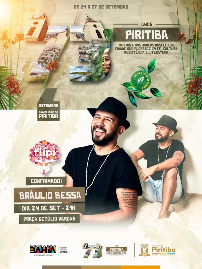 Um desses momentos já tem hora e data marcada: Bráulio Bessa estará em Piritiba, na Praça Getúlio Vargas, no dia 24 de setembro, às 21h, abrilhantando ainda mais essa grande celebração.